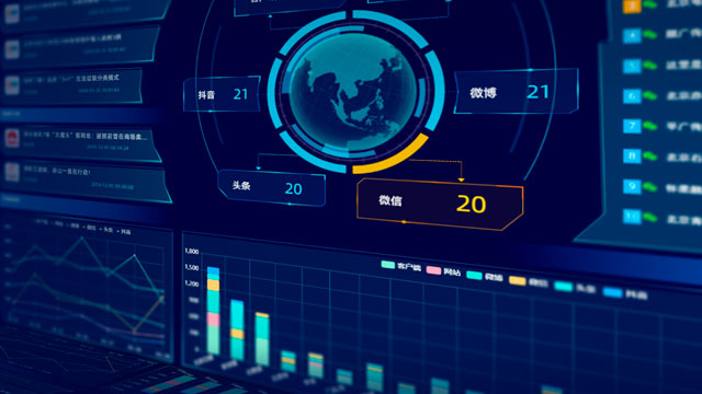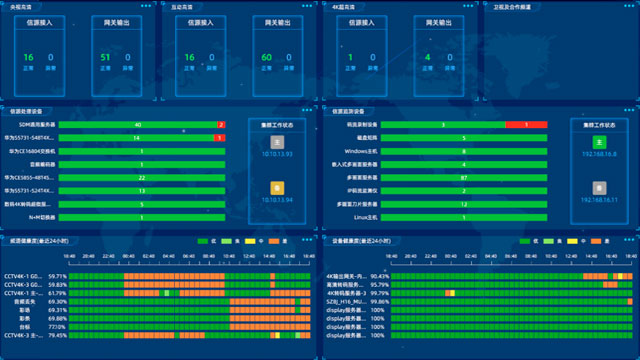 利用数字孪生技术对新媒体播控平台的业务流程、视音频内容等播出要素,系统设备、机房机架等生产要素,温湿度、烟感、水浸、电力、安防等环境因素进行综合采集监测呈现,提供最直观的管理窗口。