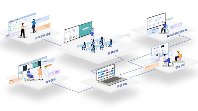 融合线上教学空间与智慧教室空间,开展混合教学方式。课前,可以通过线上教学平台上进行备课,引用校本资源,协同备课,确认教学重点;课中,可以使用云课堂教学终端,快速使用准备好的课程资料教学和开展课程活动,实现多视窗教学、互动研讨教学和跨空间教学;课后,线上做作业测验,生成课程的分析报告。